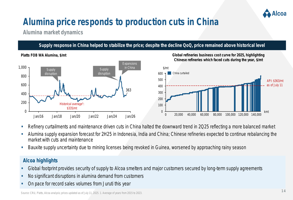 No mercado de alumina, a Alcoa observou que as respostas de oferta na China ajudaram a estabilizar os preços apesar do declínio sequencial, com cortes de refinarias e reduções impulsionadas por manutenção interrompendo a tendência de queda no 2º tri: