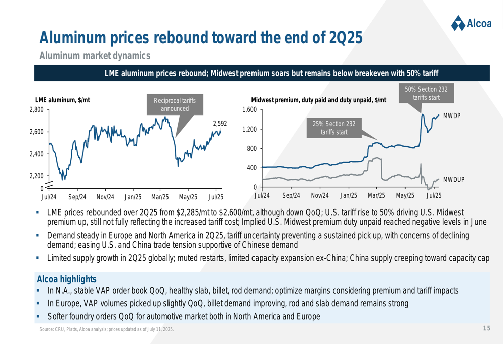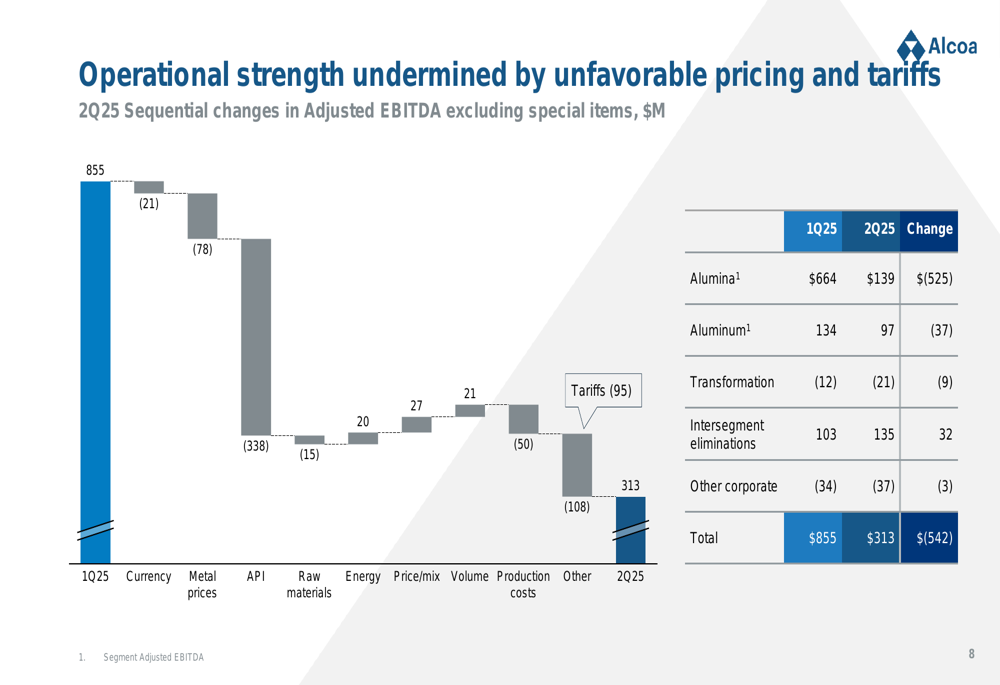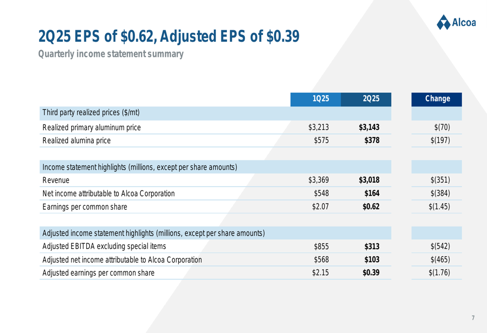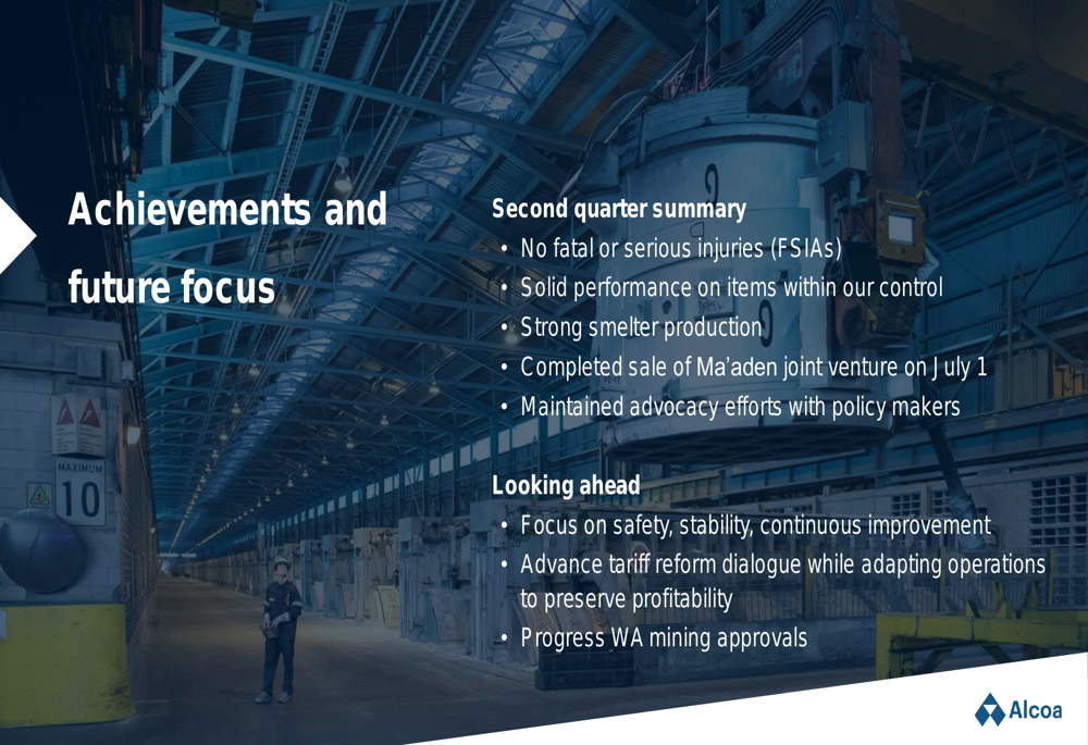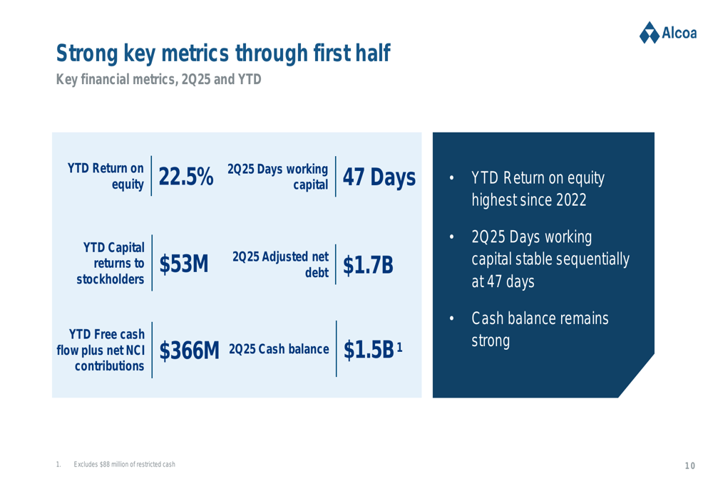 Durante o trimestre, a Alcoa fez progressos significativos em iniciativas estratégicas projetadas para fortalecer sua posição de longo prazo. Mais notavelmente, a empresa concluiu a venda de sua participação na joint venture Ma’aden em 1º de julho, avaliada em US$ 1,35 bilhão, com US$ 150 milhões em receitas de caixa cobrindo principalmente impostos e custos de transação.