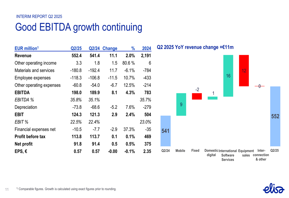 A Elisa reportou receita de €552,4 milhões para o 2º tri 2025, representando um aumento de 2,0% em relação ao ano anterior. O EBITDA comparável cresceu mais substancialmente em 4,3%, atingindo €198 milhões com uma margem melhorada de 35,8%. O lucro líquido mostrou um aumento modesto de 0,5% para €91,8 milhões, resultando em um lucro por ação de €0,57.