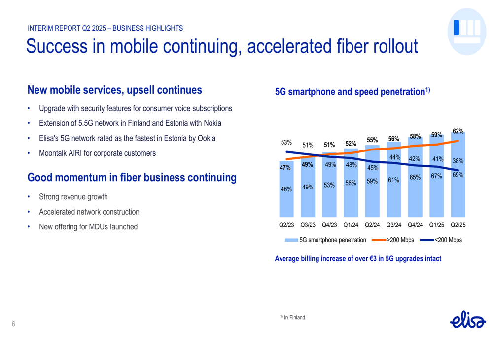 A adoção do 5G continua impulsionando o crescimento na Finlândia, com a penetração de smartphones atingindo 62% no 2º tri 2025, acima dos 47% no 2º tri 2023. Conexões de alta velocidade (>200 Mbps) também aumentaram substancialmente para 69% de penetração. Importante destacar que a empresa manteve um aumento médio de faturamento de mais de €3 para clientes que migraram para serviços 5G.