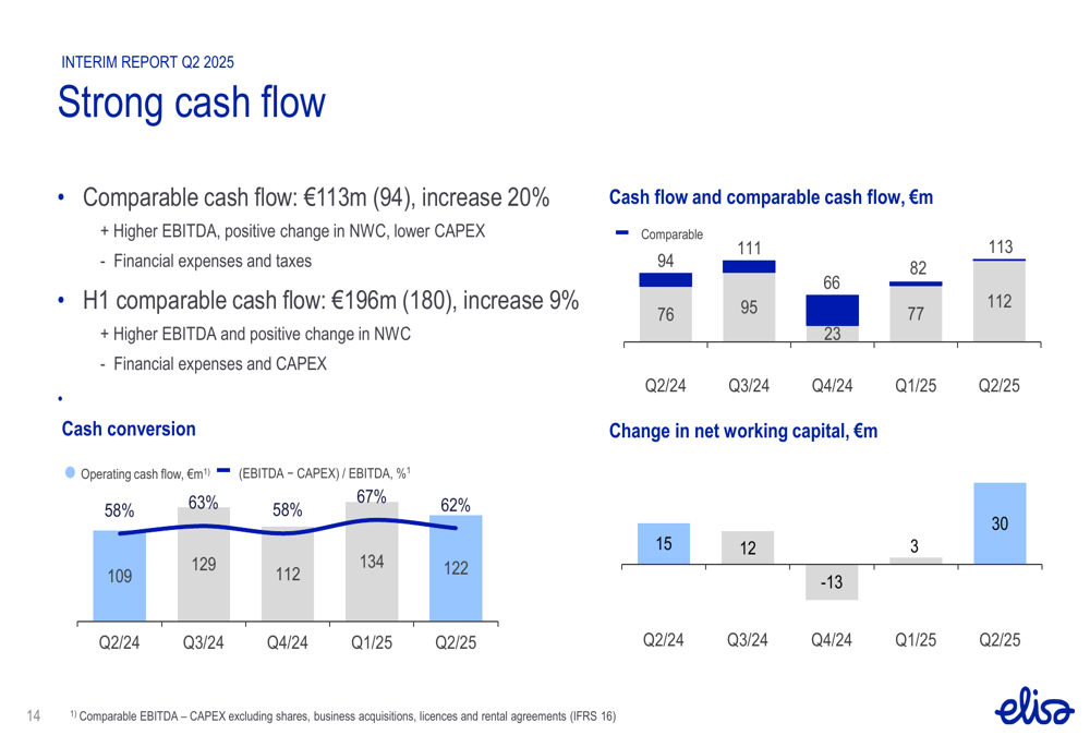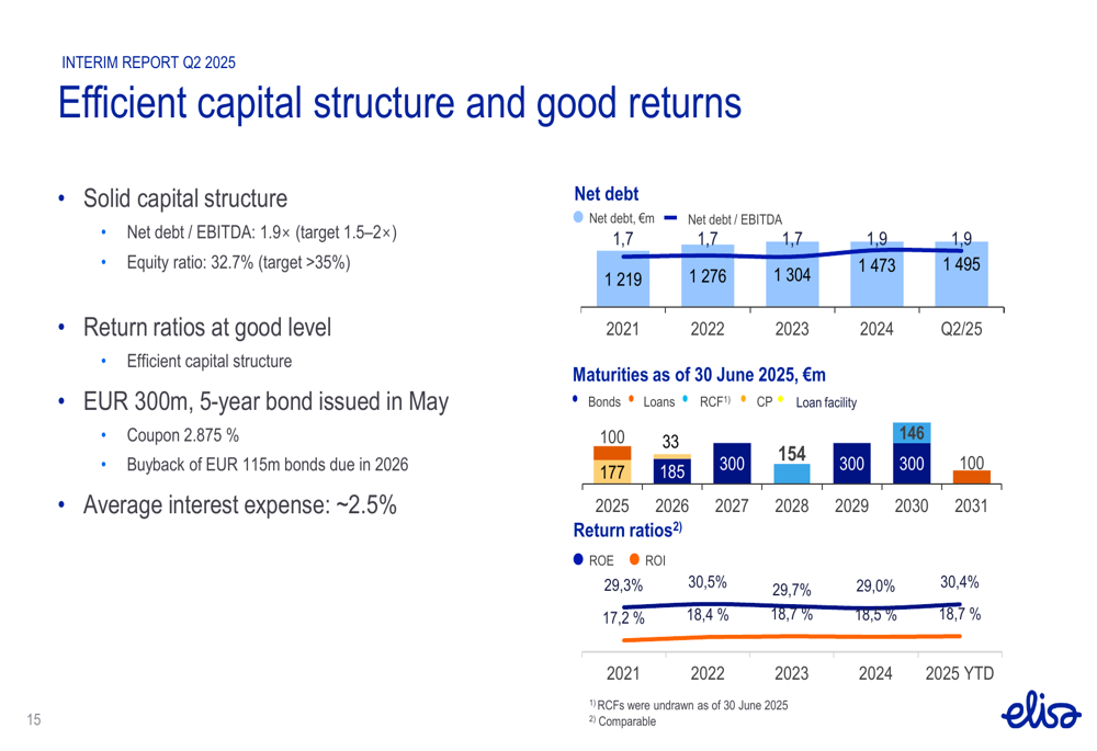 A posição financeira da Elisa permanece sólida com uma relação de dívida líquida para EBITDA de 1,9×, dentro da faixa alvo de 1,5-2×. A empresa emitiu um título de €300 milhões com prazo de 5 anos em maio, com cupom de 2,875%, e mantém uma despesa média de juros de aproximadamente 2,5%.