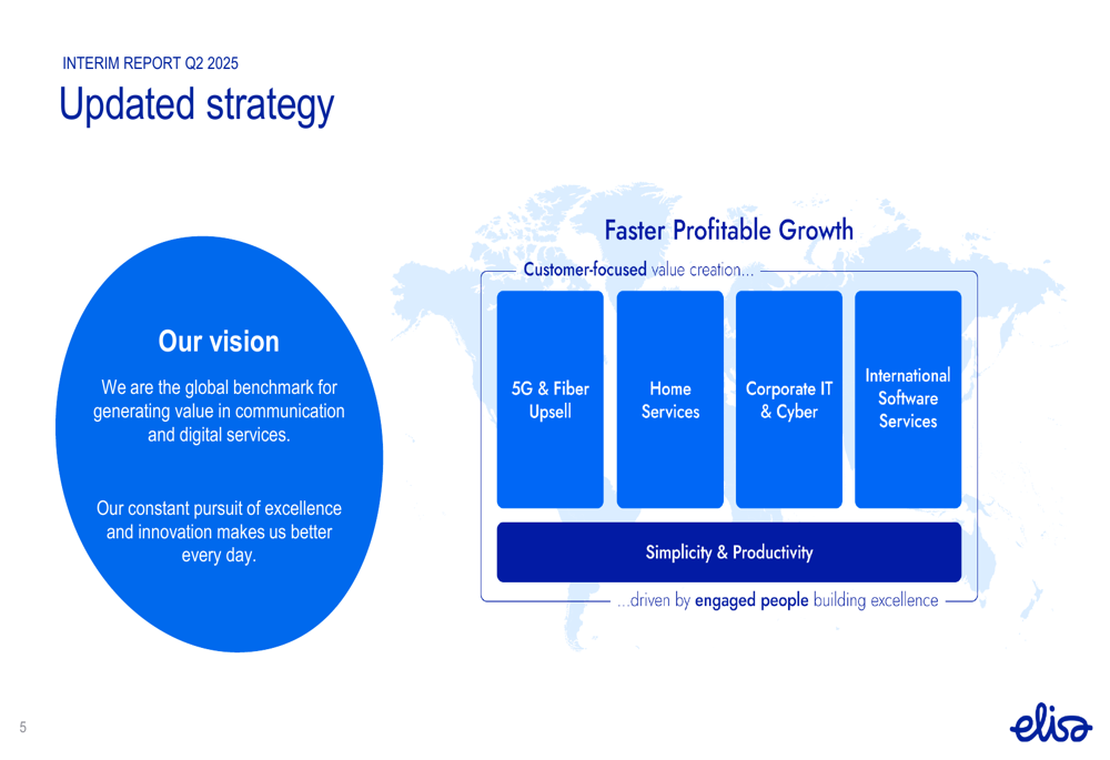 A Elisa atualizou seu framework estratégico para focar na criação de valor centrada no cliente e acelerar o crescimento lucrativo. A empresa visa ser a referência global para geração de valor em comunicação e serviços digitais, com áreas-chave incluindo venda adicional de 5G e fibra, serviços domésticos, TI corporativa e cibersegurança, e serviços de software internacional.