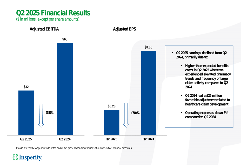 O principal fator por trás da queda nos lucros da Insperity foi o custo de benefícios acima do esperado. A empresa observou que no 2º tri 2024, havia registrado um ajuste favorável de US$ 25 milhões relacionado ao desenvolvimento de reivindicações de saúde, o que criou uma comparação desafiadora ano a ano. Além disso, as despesas operacionais diminuíram 3% em comparação com o 2º tri 2024, indicando os esforços da administração para controlar custos em meio a pressões de lucratividade.