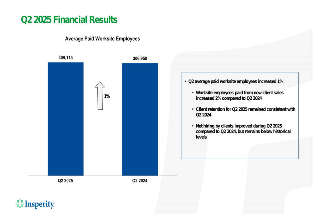 A Insperity reportou um crescimento modesto em sua base de funcionários, uma métrica operacional chave para o modelo de negócios PEO (Organização Profissional de Empregadores) da empresa. A média de funcionários pagos aumentou para 309.115 no 2º tri 2025, representando um crescimento de 1% ano a ano em comparação com 306.958 no 2º tri 2024.