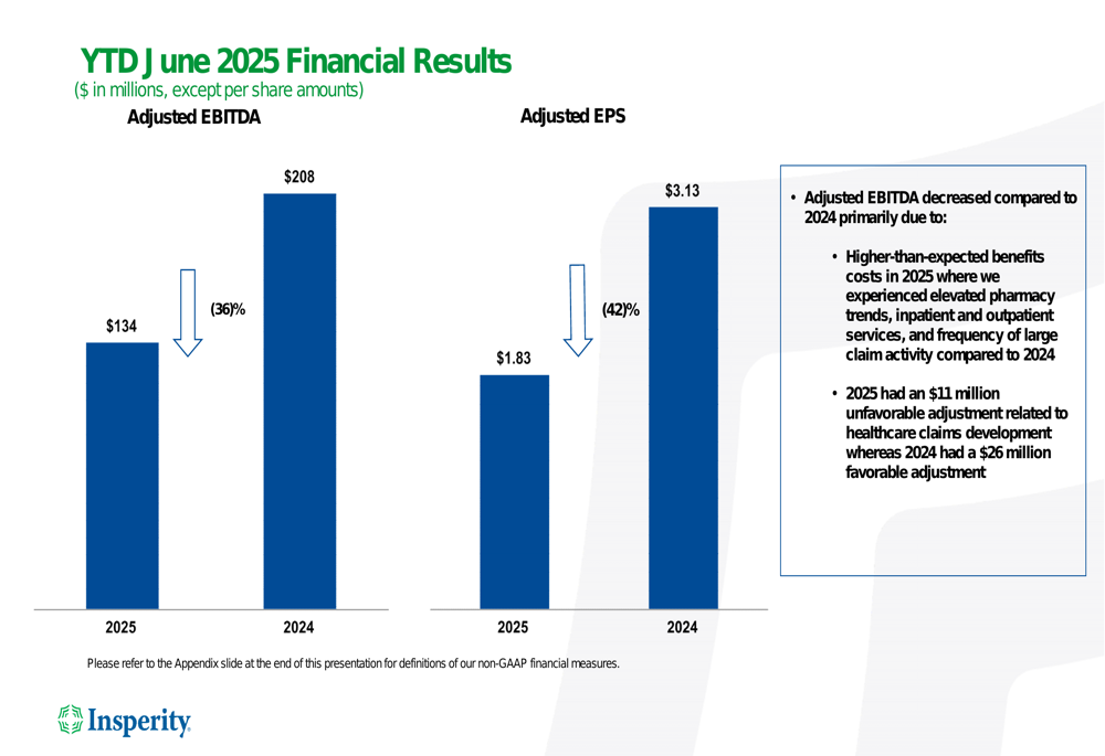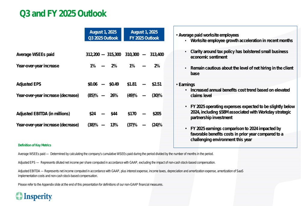 Para o ano completo de 2025, a Insperity prevê uma média de funcionários entre 310.300 e 313.400 (crescimento de 1-2%), LPA ajustado entre US$ 1,81 e US$ 2,51, e EBITDA ajustado entre US$ 170 milhões e US$ 205 milhões.