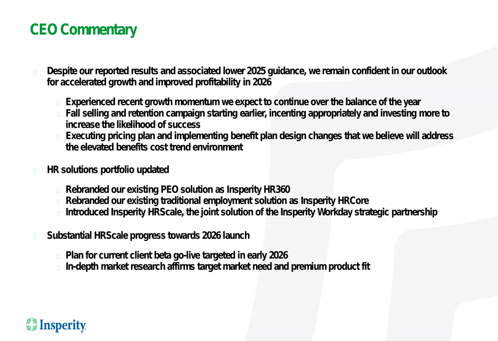 As prioridades estratégicas incluem a execução do plano de preços da empresa para enfrentar as pressões de custos de benefícios, atualização do portfólio de soluções de RH com rebranding das soluções PEO e de emprego tradicional, e a introdução do Insperity HRScale. A administração destacou "progresso substancial do HRScale em direção ao lançamento de 2026" e "pesquisa de mercado positiva" apoiando essas iniciativas.