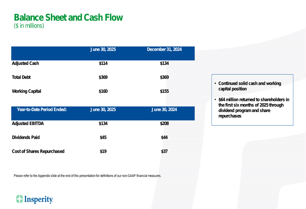 Apesar dos desafios nos lucros, a Insperity manteve um balanço sólido com US$ 114 milhões em caixa ajustado e US$ 160 milhões em capital de giro em 30 de junho de 2025. A empresa continuou priorizando retornos aos acionistas, pagando US$ 45 milhões em dividendos e recomprando US$ 19 milhões em ações durante o primeiro semestre de 2025.