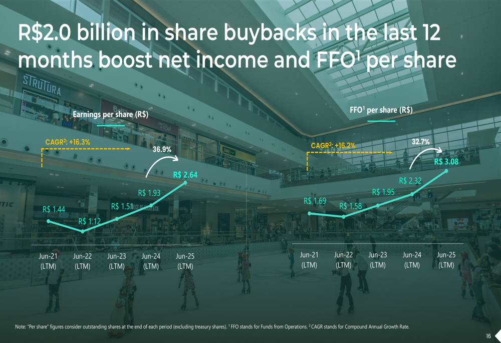 A Multiplan tem retornado capital aos acionistas ativamente, com R$ 2,0 bilhões em recompra de ações nos últimos 12 meses e R$ 545,0 milhões em dividendos distribuídos durante o mesmo período. Essas ações favoráveis aos acionistas aumentaram o lucro por ação em 36,9% ano a ano para R$ 2,64 e o FFO por ação em 32,8% para R$ 3,08.