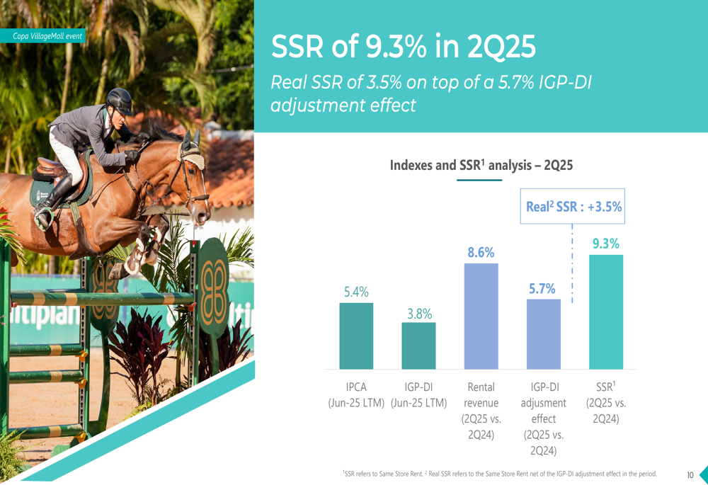 A receita de aluguel, que representa o núcleo dos negócios da Multiplan, cresceu 8,4% para R$ 427,5 milhões. O Aluguel nas Mesmas Lojas (SSR) aumentou 9,3%, com um crescimento real de SSR de 3,5% sobre um efeito de ajuste do IGP-DI de 5,7%, como mostrado nesta análise: