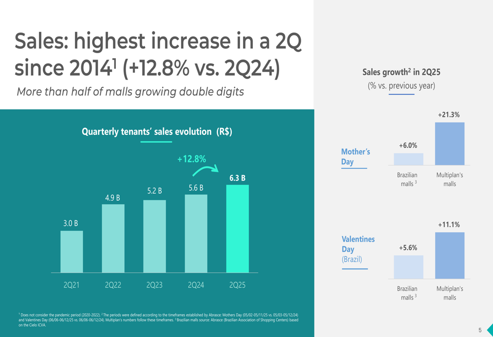 Particularmente notável foi o desempenho superior da Multiplan em comparação com o mercado brasileiro de shoppings durante períodos-chave de compras. Durante o Dia das Mães, os shoppings da Multiplan registraram crescimento de vendas de 21,3% em comparação com apenas 6,0% para os shoppings brasileiros em geral. Da mesma forma, no Dia dos Namorados, a Multiplan alcançou um crescimento de 11,1% versus 5,6% para o mercado mais amplo.
