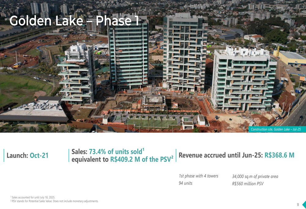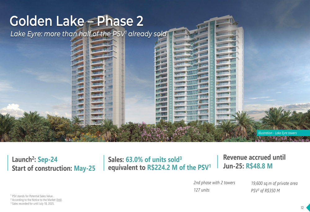 Enquanto isso, a Fase 2 do Golden Lake, que foi lançada em setembro de 2024 e começou a construção em maio de 2025, já vendeu 63,0% de suas unidades, equivalente a R$ 224,2 milhões do PSV de R$ 350 milhões. Este ritmo rápido de vendas destaca a forte demanda pelos empreendimentos residenciais da Multiplan.