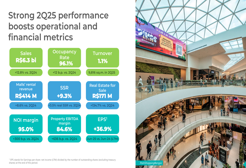 A Multiplan reportou desempenho excepcional no 2º tri 2025, com vendas dos lojistas atingindo R$ 6,3 bilhões, representando um aumento de 12,8% em comparação ao mesmo período do ano anterior. A empresa manteve uma alta taxa de ocupação de 96,1%, um aumento de 12 pontos base em relação ao ano anterior, enquanto alcançou uma margem recorde de Receita Operacional Líquida (NOI) de 95,0%, uma melhoria de 300 pontos base em relação ao 2º tri 2024.