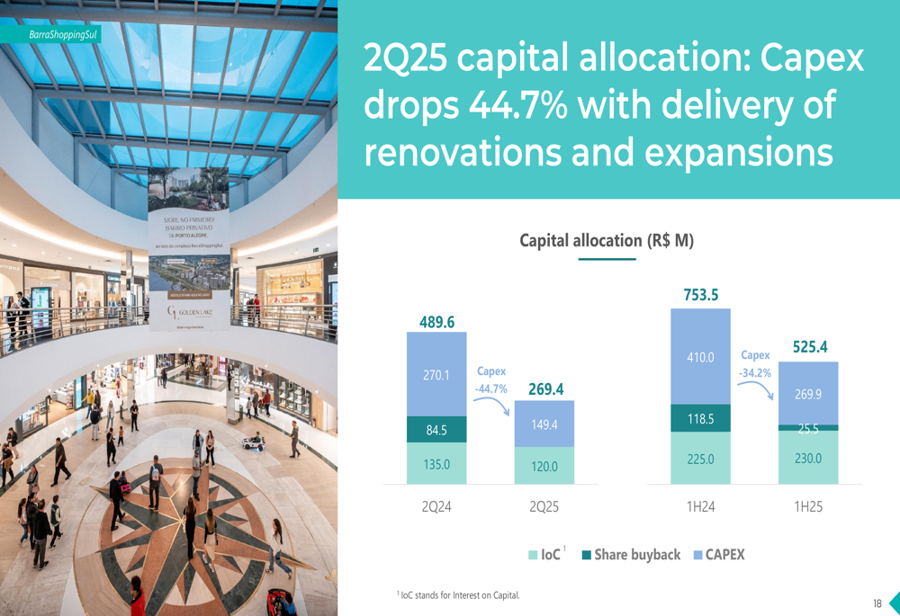 Em termos de alocação de capital para o 2º tri 2025, a Multiplan reduziu seu Capex em 44,7% para R$ 149,4 milhões, à medida que vários projetos de renovação e expansão foram concluídos. Isso permitiu um aumento no retorno aos acionistas através de pagamentos de Juros sobre Capital Próprio (JCP), que subiram para R$ 120,0 milhões no 2º tri 2025.