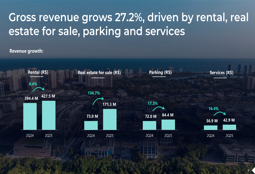 A receita bruta da Multiplan aumentou 27,2% em comparação ao 2º tri 2024, impulsionada pelo forte desempenho em todos os segmentos de negócios. O segmento de imóveis para venda foi particularmente impressionante, crescendo 134,7% para atingir R$ 171,3 milhões.