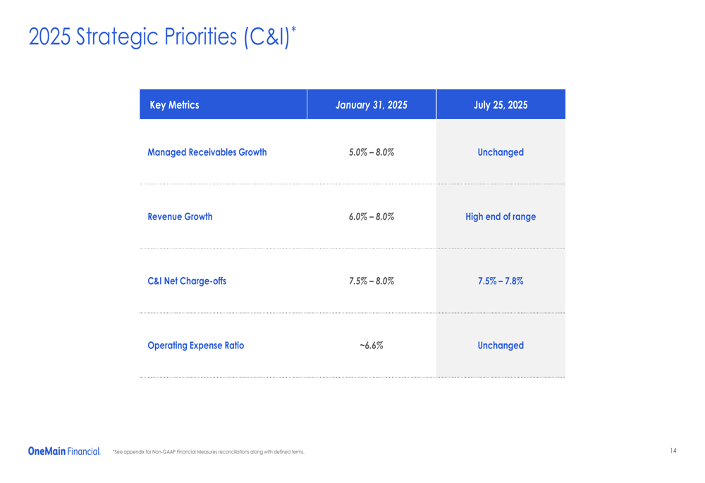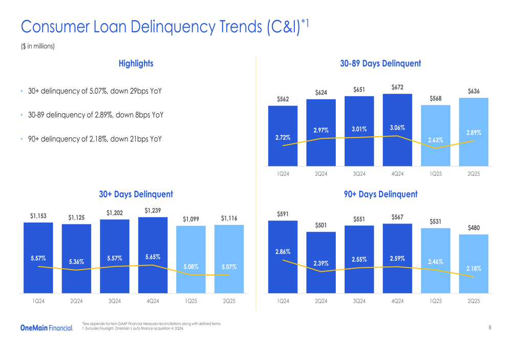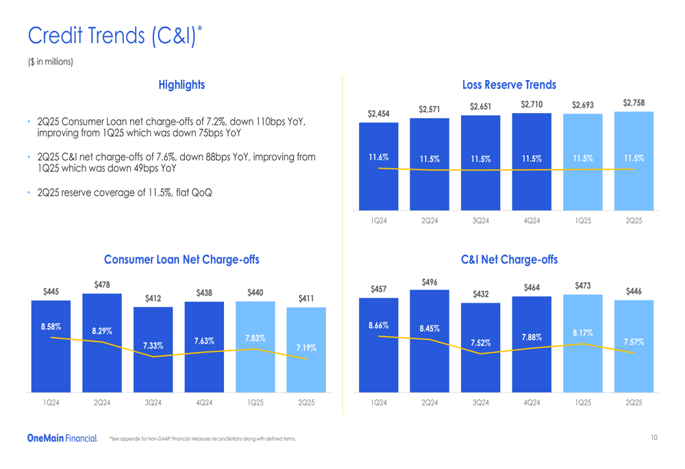 Um aspecto destacado dos resultados do 2º tri da OneMain foi a melhoria significativa nos indicadores de qualidade de crédito. As perdas líquidas em empréstimos ao consumidor diminuíram 110 pontos base em relação ao ano anterior para 7,2%, enquanto as perdas líquidas gerais de C&I caíram 88 pontos base para 7,6%.