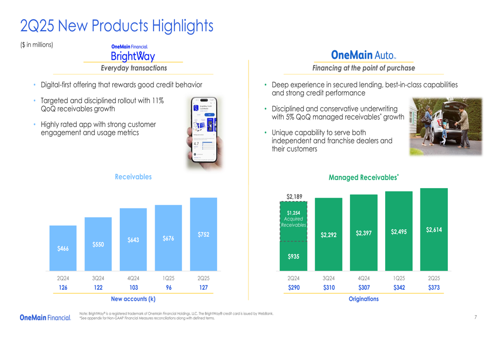 A expansão da OneMain além dos empréstimos ao consumidor tradicionais para cartões de crédito e financiamento de automóveis tornou-se um importante impulsionador de crescimento. A oferta de cartão de crédito BrightWay da empresa mostrou crescimento de recebíveis de 11% em relação ao trimestre anterior, atingindo US$ 752 milhões, enquanto os recebíveis administrados da OneMain Auto cresceram para US$ 2,6 bilhões.