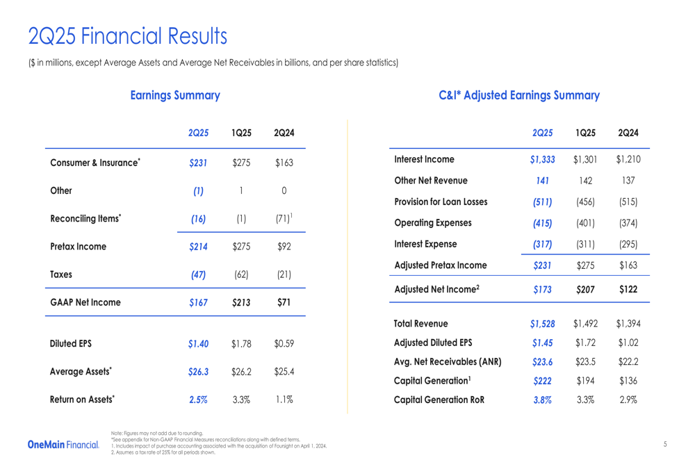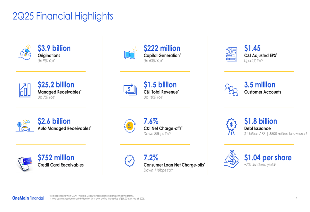 A OneMain Holdings (Nova York:OMF) apresentou seus resultados financeiros do segundo trimestre de 2025 em 25 de julho, mostrando melhorias substanciais em relação ao ano anterior em métricas-chave. A empresa, que se posiciona como a "Credora de Escolha para o Consumidor Não-Prime", reportou crescimento significativo em seu negócio principal enquanto expandia com sucesso para novas áreas de produtos.
