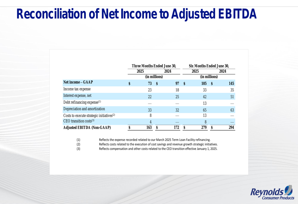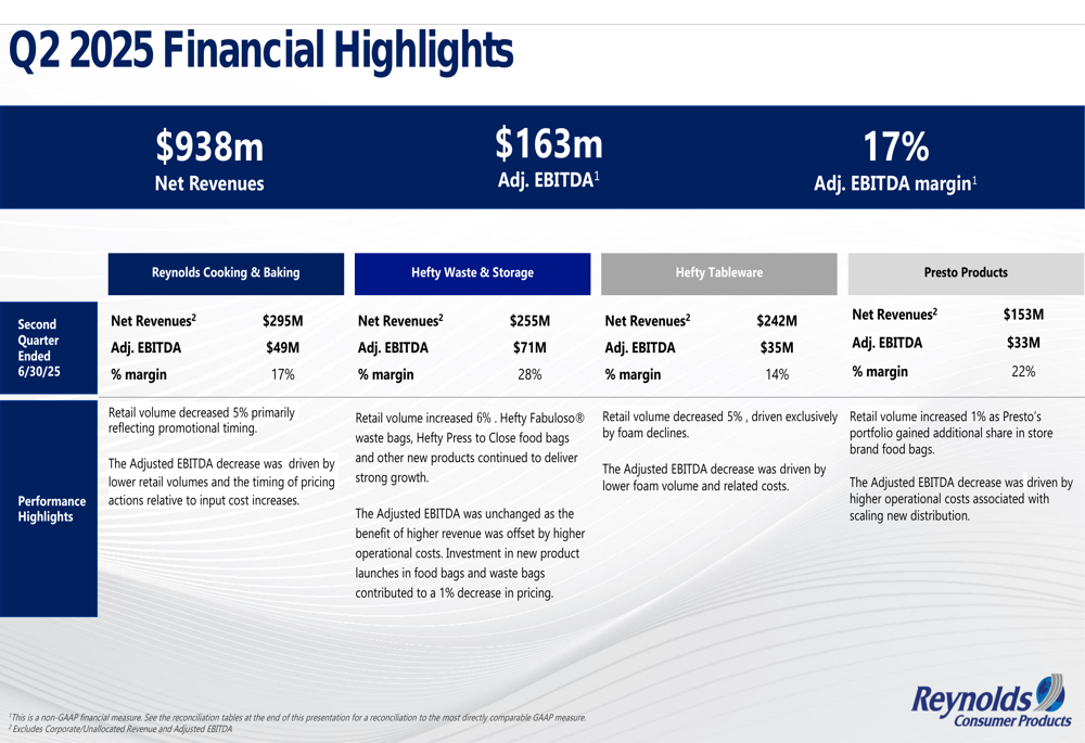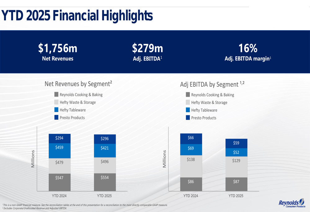 1. Reynolds Cooking & Baking: Gerou US$ 295 milhões em receitas líquidas com margem de EBITDA ajustado de 17%. O volume de varejo diminuiu 5%, com o declínio do EBITDA ajustado impulsionado principalmente por volumes de varejo mais baixos e questões de timing relacionadas a ações de preços versus aumentos de custos de insumos.
