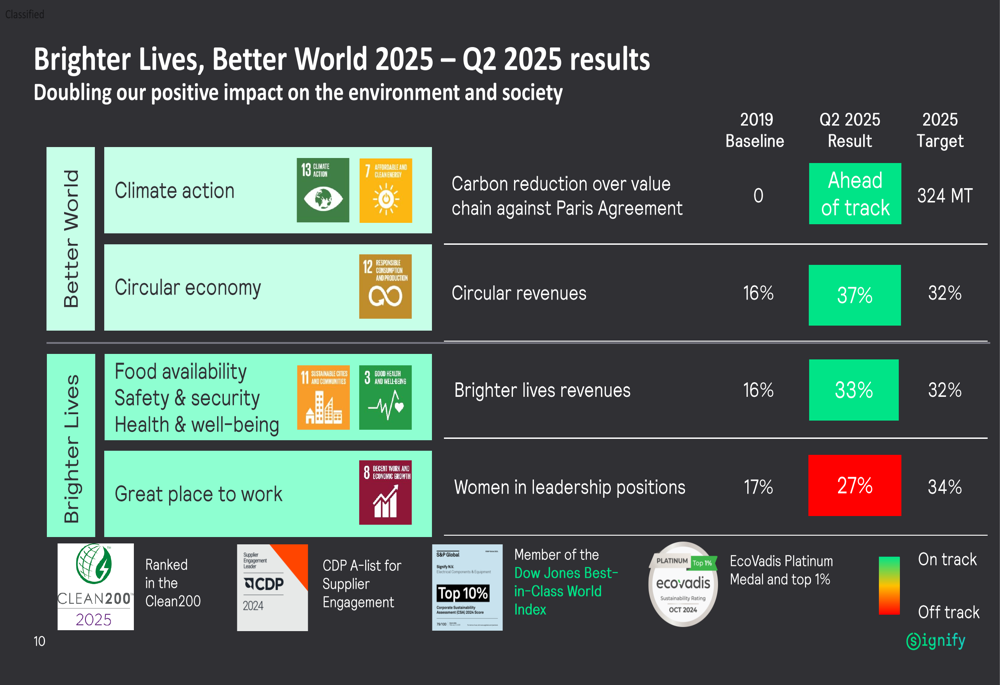 A apresentação destacou que a Signify está à frente do cronograma em ação climática, alcançou 37% de receitas circulares (contra uma meta de 32% para 2025) e atingiu 33% de receitas de iniciativas para vidas mais brilhantes (superando a meta de 32%). Mulheres em posições de liderança aumentaram para 27%, embora ainda abaixo da meta de 34% para 2025.