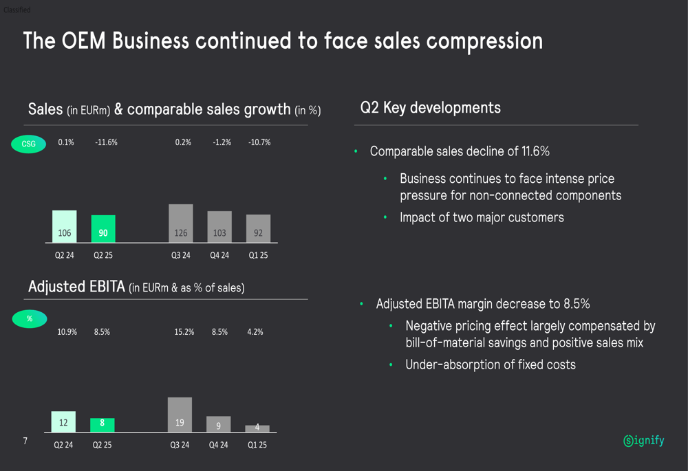Em contraste, o negócio OEM continuou enfrentando desafios significativos, com vendas comparáveis caindo 11,6%. A apresentação citou intensa pressão de preços para componentes não conectados e o impacto de dois grandes clientes como fatores-chave. Apesar desses desafios, o segmento manteve uma margem EBITA ajustada de 8,5%, já que os efeitos negativos de preços foram amplamente compensados por economias na lista de materiais e um mix de vendas positivo.