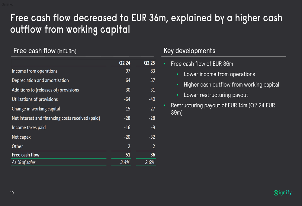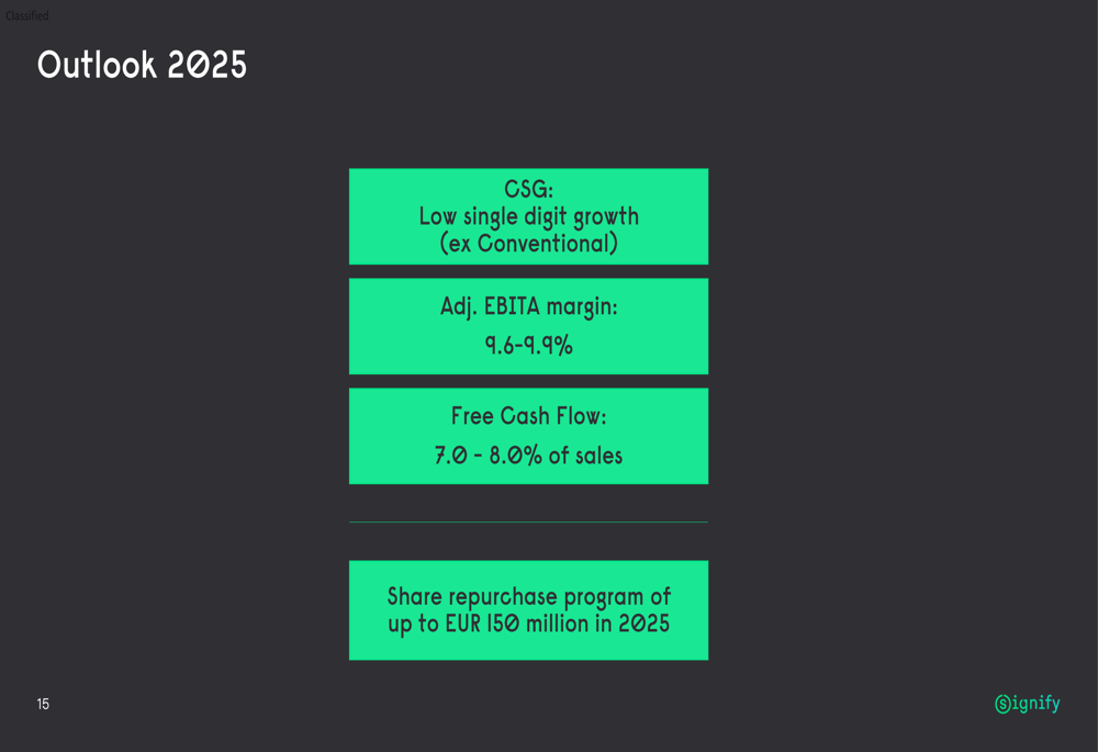 Olhando para o restante de 2025, a Signify mantém sua perspectiva de crescimento de baixo dígito único, excluindo o negócio Convencional. A empresa espera uma margem EBITA ajustada entre 9,6% e 9,9%, e fluxo de caixa livre de 7,0-8,0% das vendas.