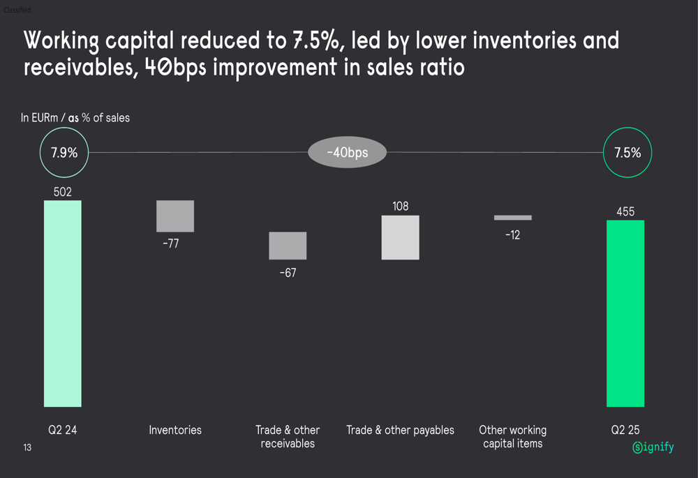 A Signify fez progressos significativos na gestão de capital de giro, reduzindo o capital de giro para 7,5% das vendas, contra 7,9% no 2º tri de 2024. Esta melhoria foi impulsionada por menores estoques (-US$ 77 milhões) e redução de contas a receber (-US$ 67 milhões), parcialmente compensada por menores contas a pagar (US$ 108 milhões).