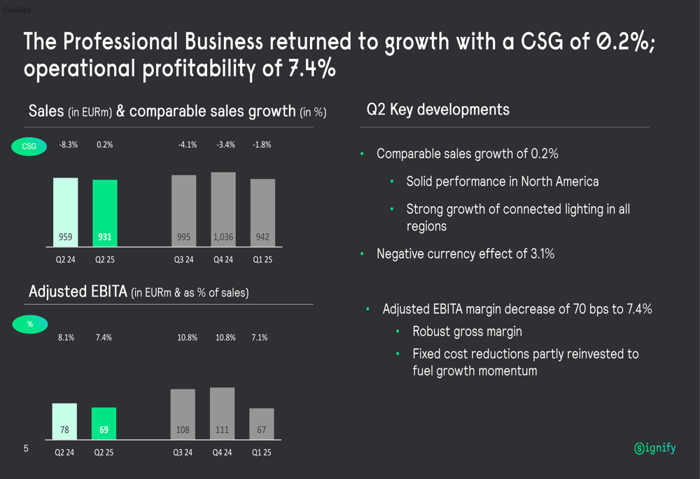 O segmento Profissional, a maior unidade de negócios da Signify, alcançou um modesto crescimento de vendas comparáveis de 0,2% com uma margem EBITA ajustada de 7,4%. A apresentação destacou um desempenho sólido na América do Norte e forte crescimento em iluminação conectada em todas as regiões, parcialmente compensado por um efeito cambial negativo de 3,1%.