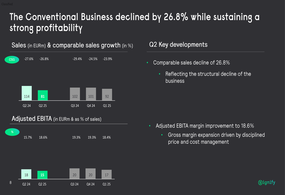 O negócio Convencional, que inclui tecnologias de iluminação tradicionais, continuou seu declínio esperado com queda nas vendas comparáveis de 26,8%. No entanto, este segmento manteve forte lucratividade com uma margem EBITA ajustada de 18,6%, destacando a gestão eficaz da Signify neste negócio em extinção.