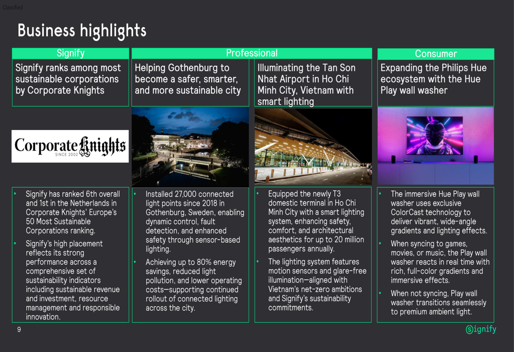 A Signify continua a fazer progressos significativos em suas metas de sustentabilidade sob o programa "Brighter Lives, Better World 2025". A empresa ficou em 6º lugar geral e 1º nos Países Baixos no ranking da Corporate Knights das 50 Corporações Mais Sustentáveis da Europa.