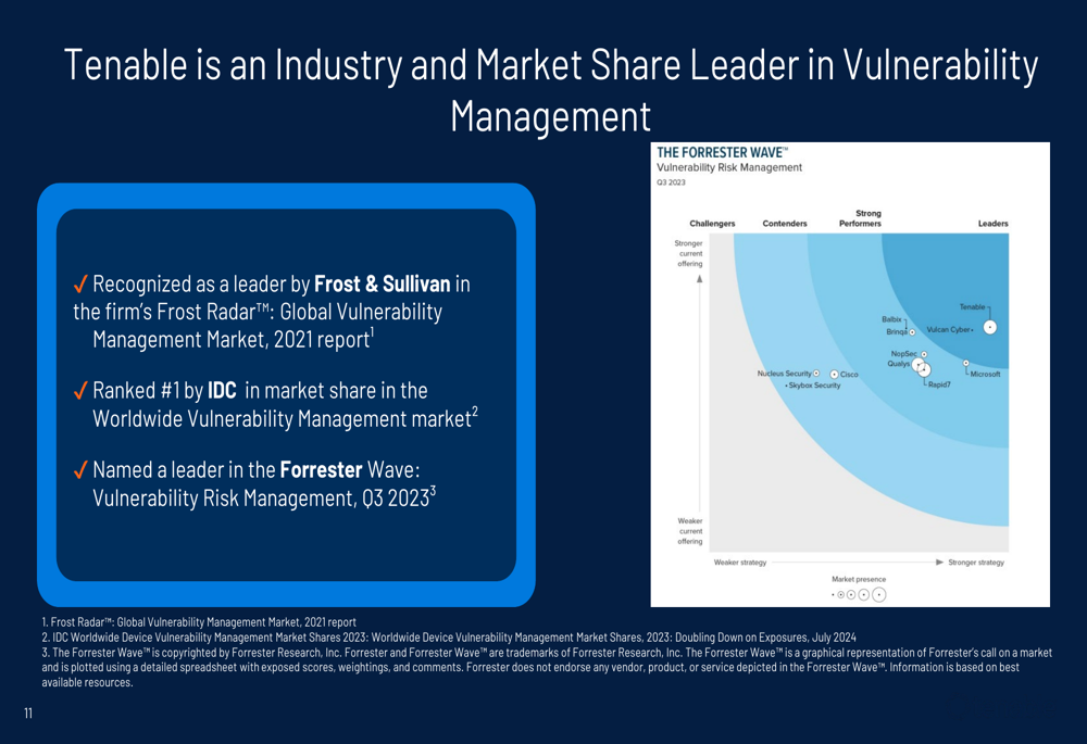 A Tenable estabeleceu-se como líder no espaço de gerenciamento de vulnerabilidades, com reconhecimento de importantes analistas da indústria, incluindo Frost & Sullivan, IDC e Forrester. A empresa reivindica a posição #1 de participação de mercado em gerenciamento de vulnerabilidades, fornecendo uma base sólida para sua expansão no gerenciamento mais amplo de exposição.