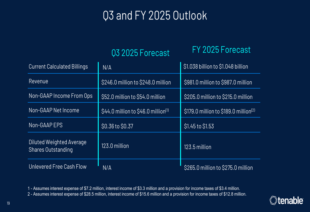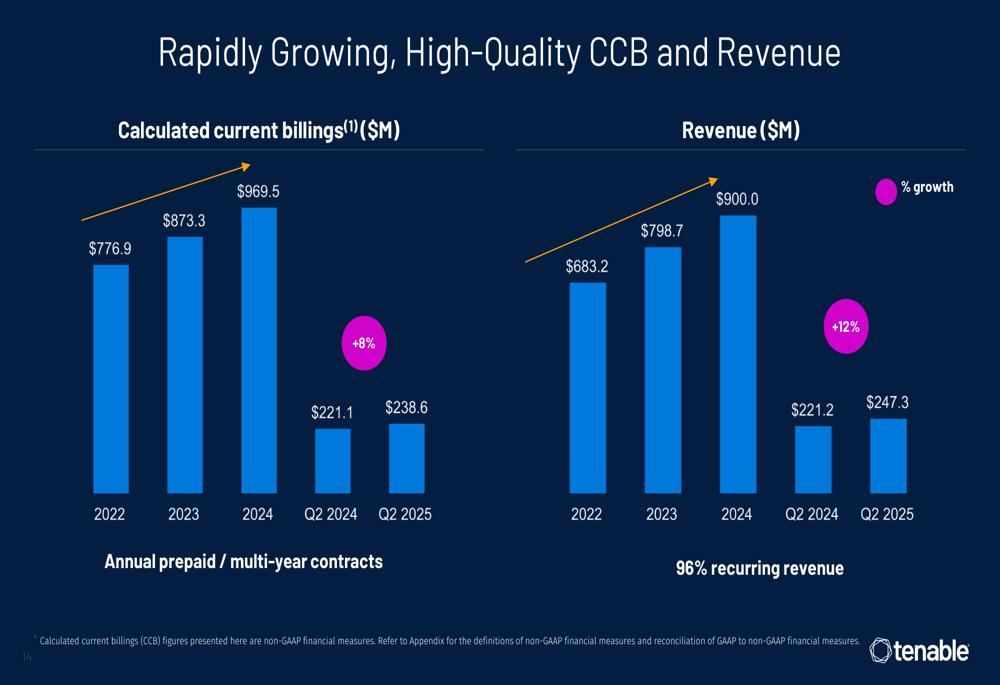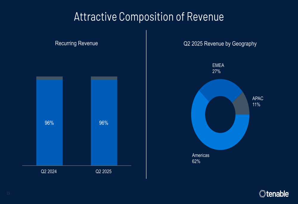 A Tenable entregou resultados financeiros sólidos no 2º tri 2025, com receita alcançando US$ 247,3 milhões, um aumento de 12% ano a ano. A empresa manteve seu perfil de receita de alta qualidade com 96% de receita recorrente e gerou US$ 44,3 milhões em fluxo de caixa livre não alavancado durante o trimestre.