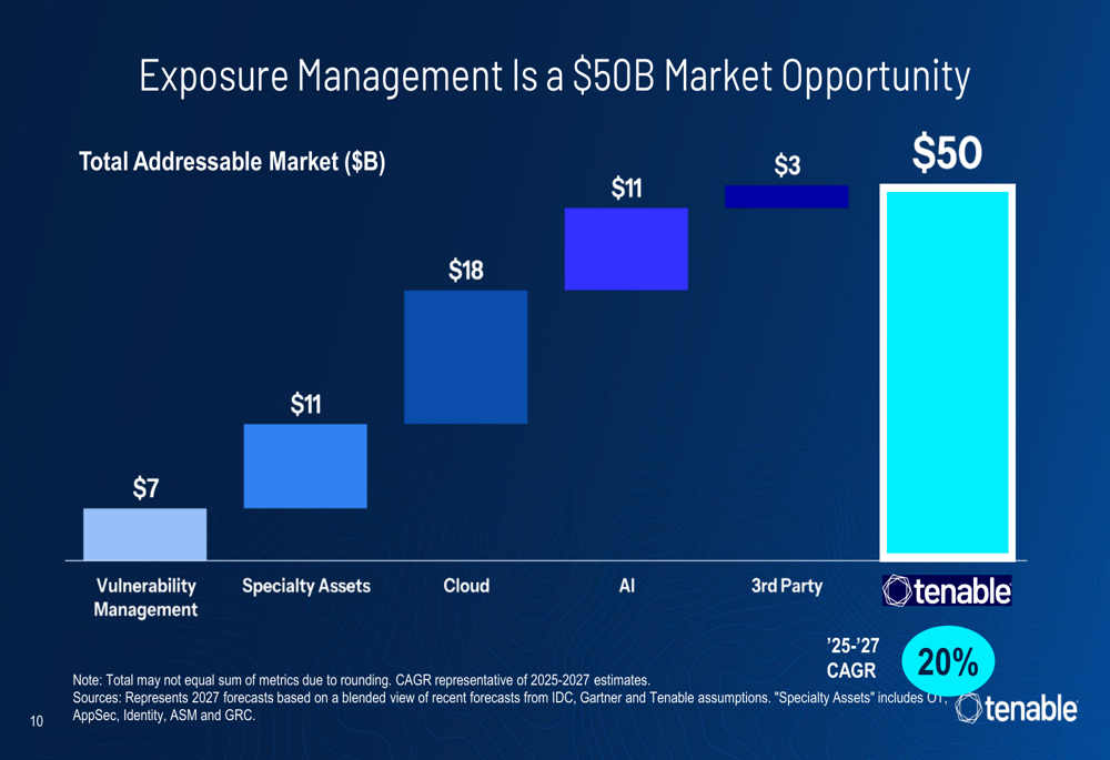 A Tenable Holdings Inc. (NASDAQ:TENB) apresentou seus resultados do 2º tri 2025 e estratégia corporativa em 30 de julho de 2025, destacando sua transformação de provedora tradicional de gerenciamento de vulnerabilidades para uma plataforma abrangente de gerenciamento de exposição. A empresa está se posicionando para capturar uma fatia maior do que estima ser um mercado total endereçável de US$ 50 bilhões, crescendo a uma CAGR de 20% até 2027.