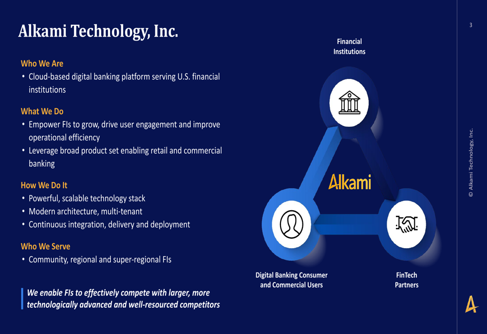 Como mostrado na seguinte visão geral do modelo de negócios e posicionamento de mercado da Alkami: