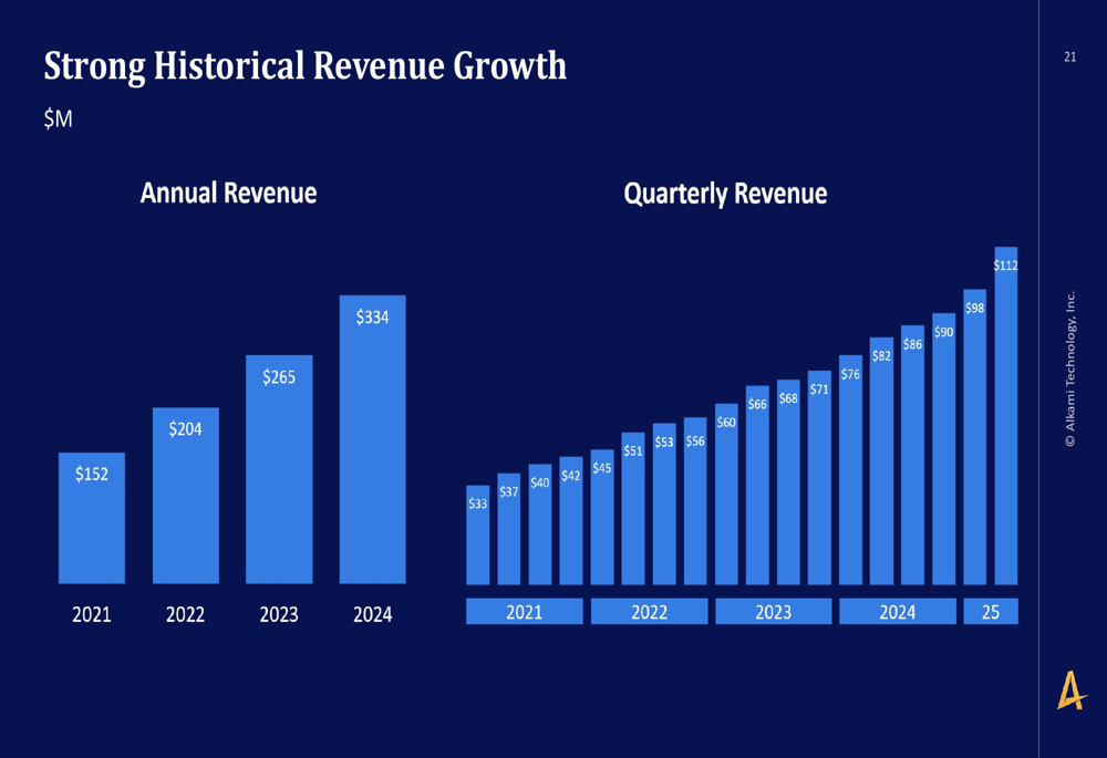 O crescimento histórico de receita da Alkami tem sido forte e consistente, como mostrado no gráfico a seguir que acompanha as tendências de receita anuais e trimestrais: