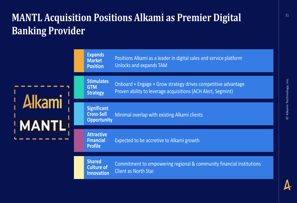 Um desenvolvimento estratégico significativo destacado na apresentação foi a aquisição da MANTL pela Alkami, que posiciona a empresa como uma fornecedora premium de serviços bancários digitais com capacidades expandidas em abertura digital de contas e originação de empréstimos. Esta aquisição amplia o mercado total endereçável da Alkami e cria oportunidades significativas de venda cruzada com sobreposição mínima entre os clientes existentes.
