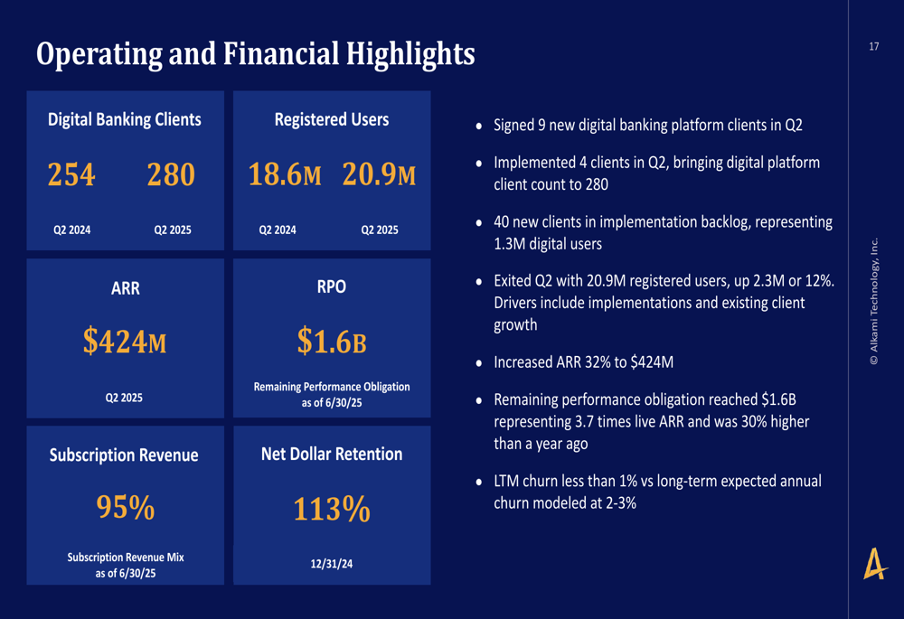 A Alkami Technology Inc (NASDAQ:ALKT), fornecedora de plataforma digital bancária baseada em nuvem que atende instituições financeiras dos EUA, apresentou resultados sólidos no segundo trimestre de 2025 em 30 de julho, mostrando impulso contínuo em seu negócio principal e expansão estratégica através de aquisição. A empresa opera em um mercado total estimado em US$ 14 bilhões, focando em instituições financeiras comunitárias, regionais e super-regionais com ativos entre US$ 100 milhões e US$ 450 bilhões.