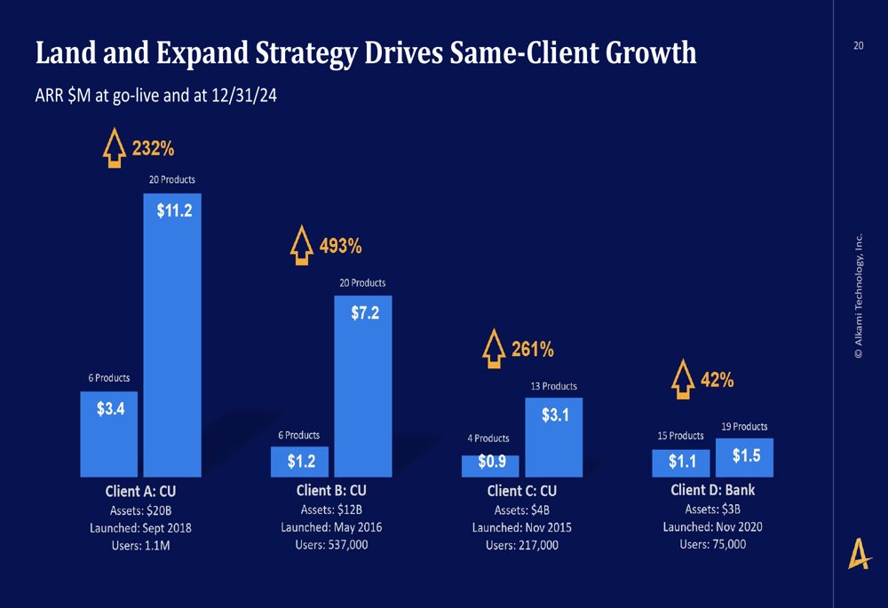 A estratégia de "terreno e expansão" da empresa tem sido bem-sucedida em impulsionar o crescimento com os mesmos clientes, com vários exemplos mostrando expansão significativa de ARR após a implementação inicial. Por exemplo, o Cliente A (uma cooperativa de crédito com US$ 20 bilhões em ativos) viu crescimento de ARR de 232% de US$ 3,4 milhões no lançamento para US$ 11,2 milhões até o final de 2024, enquanto expandia de 6 produtos para 20 produtos.