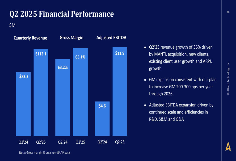 A Alkami reportou receita de US$ 112,1 milhões no 2º tri de 2025, representando um aumento de 36% em comparação ao 2º tri de 2024. Este crescimento foi impulsionado pela aquisição da MANTL, adição de novos clientes, crescimento de usuários de clientes existentes e aumento da receita média por usuário (ARPU). O EBITDA ajustado da empresa alcançou US$ 11,9 milhões, uma melhoria significativa em relação aos US$ 4,6 milhões no mesmo período do ano anterior. A margem bruta expandiu para 65,1%, acima dos 63,2% no 2º tri de 2024, consistente com o plano da empresa de aumentar a margem bruta em 200-300 pontos base anualmente até 2026.