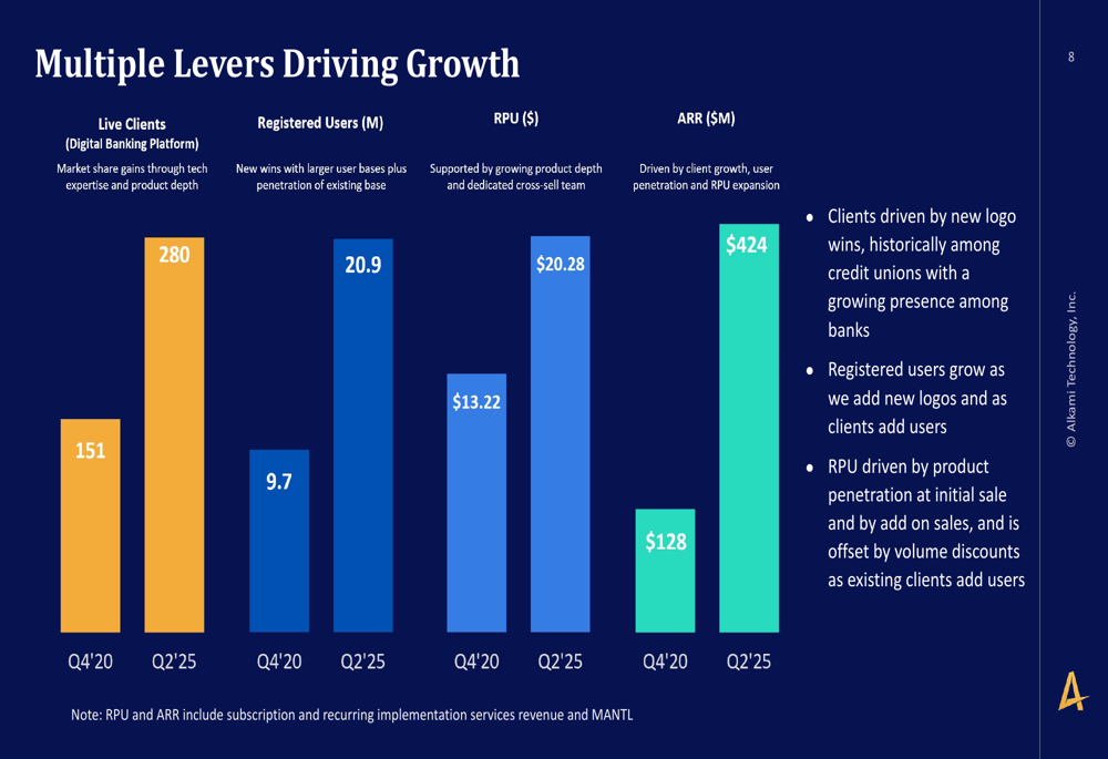 A estratégia de crescimento da Alkami aproveita múltiplas alavancas, incluindo a expansão de sua base de clientes, aumento de usuários registrados e crescimento da receita por usuário (RPU). Desde o 4º tri de 2020, a empresa aumentou seus clientes ativos de 151 para 280, usuários registrados de 9,7 milhões para 20,9 milhões, e RPU de US$ 13,22 para US$ 20,28, resultando em crescimento de ARR de US$ 128 milhões para US$ 424 milhões.