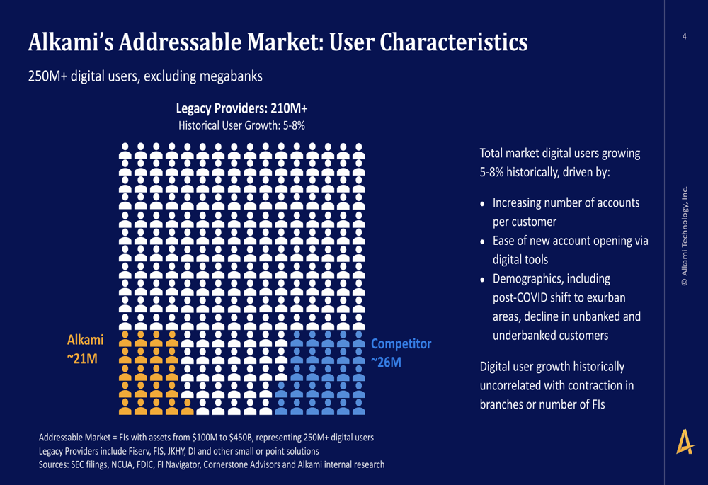 A Alkami se posiciona em um mercado de serviços bancários digitais que atende mais de 250 milhões de usuários, excluindo megabancos. A empresa atualmente atende aproximadamente 21 milhões desses usuários, enquanto seu principal concorrente atende cerca de 26 milhões, e provedores legados como Fiserv, FIS, JKHY e DI respondem por mais de 210 milhões de usuários.