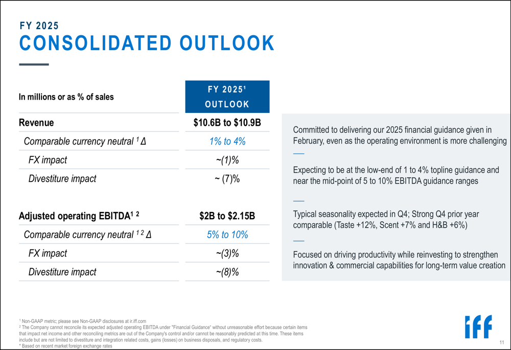 Para o ano completo de 2025, a IFF manteve sua orientação com receita esperada entre US$ 10,6 bilhões e US$ 10,9 bilhões (representando crescimento comparável em moeda constante de 1% a 4%) e EBITDA operacional ajustado entre US$ 2,0 bilhões e US$ 2,15 bilhões (crescimento comparável em moeda constante de 5% a 10%).