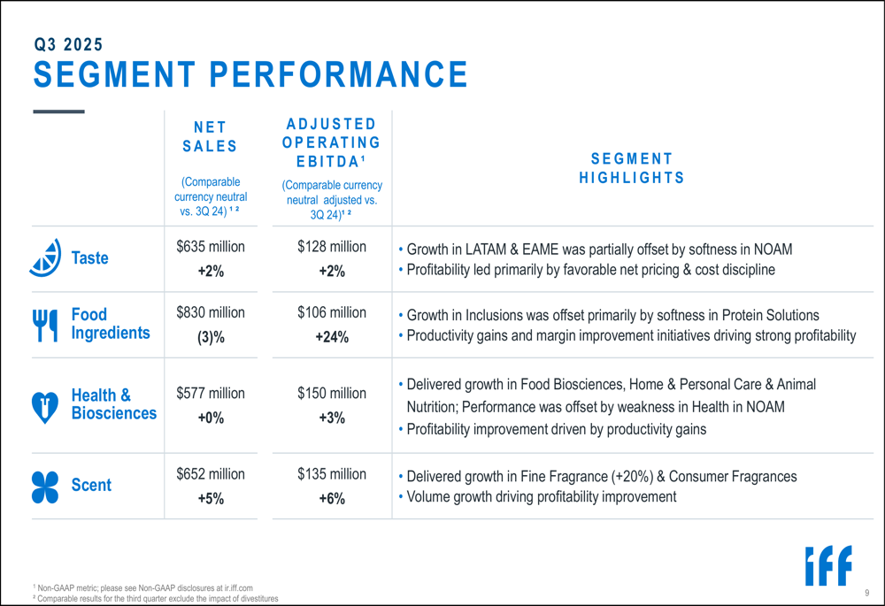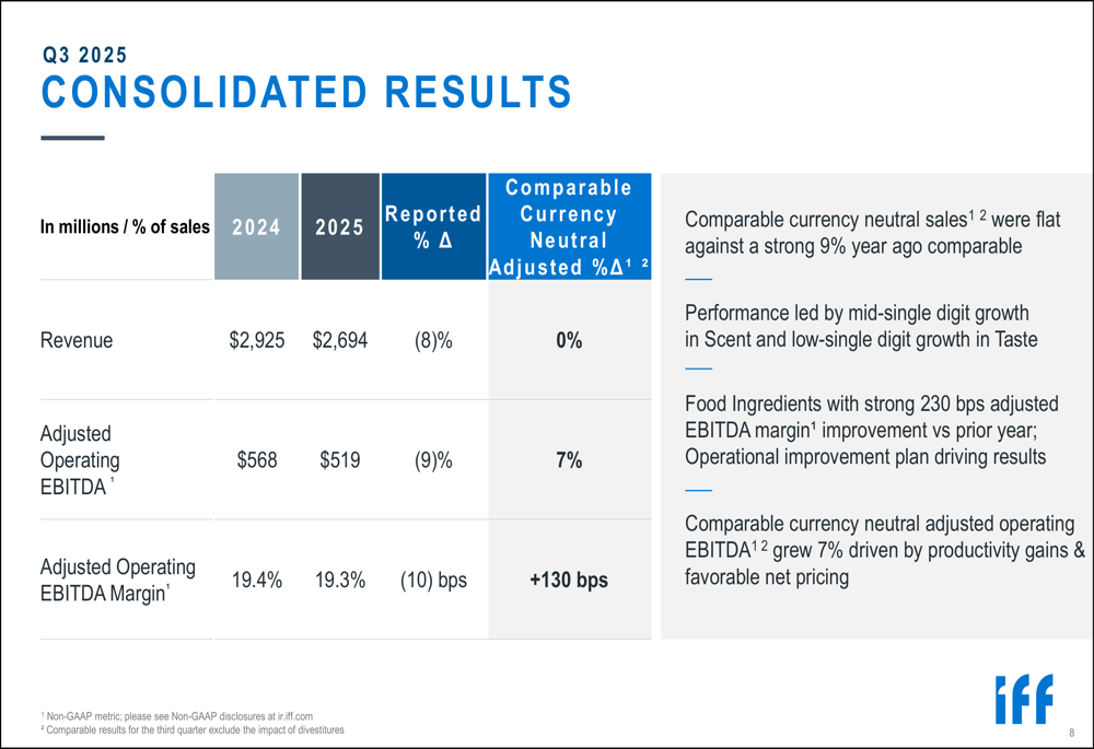A IFF reportou receita de US$ 2.694 milhões no 3º tri 2025, representando uma queda de 8% em relação ao ano anterior, mas desempenho estável em base comparável de moeda constante contra um forte comparável de 9% do ano anterior. O EBITDA operacional ajustado atingiu US$ 519 milhões, queda de 9% conforme reportado, mas alta de 7% em base comparável de moeda constante.