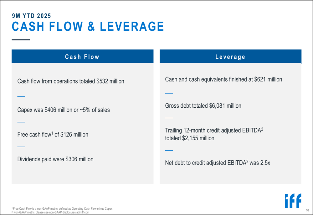 No aspecto financeiro, a IFF melhorou seu índice de alavancagem para aproximadamente 2,5x dívida líquida para EBITDA ajustado ao crédito e anunciou uma autorização de recompra de ações de US$ 500 milhões, sinalizando um retorno a uma abordagem mais equilibrada de alocação de capital. A empresa gerou US$ 532 milhões em fluxo de caixa operacional e US$ 126 milhões em fluxo de caixa livre nos primeiros nove meses de 2025.