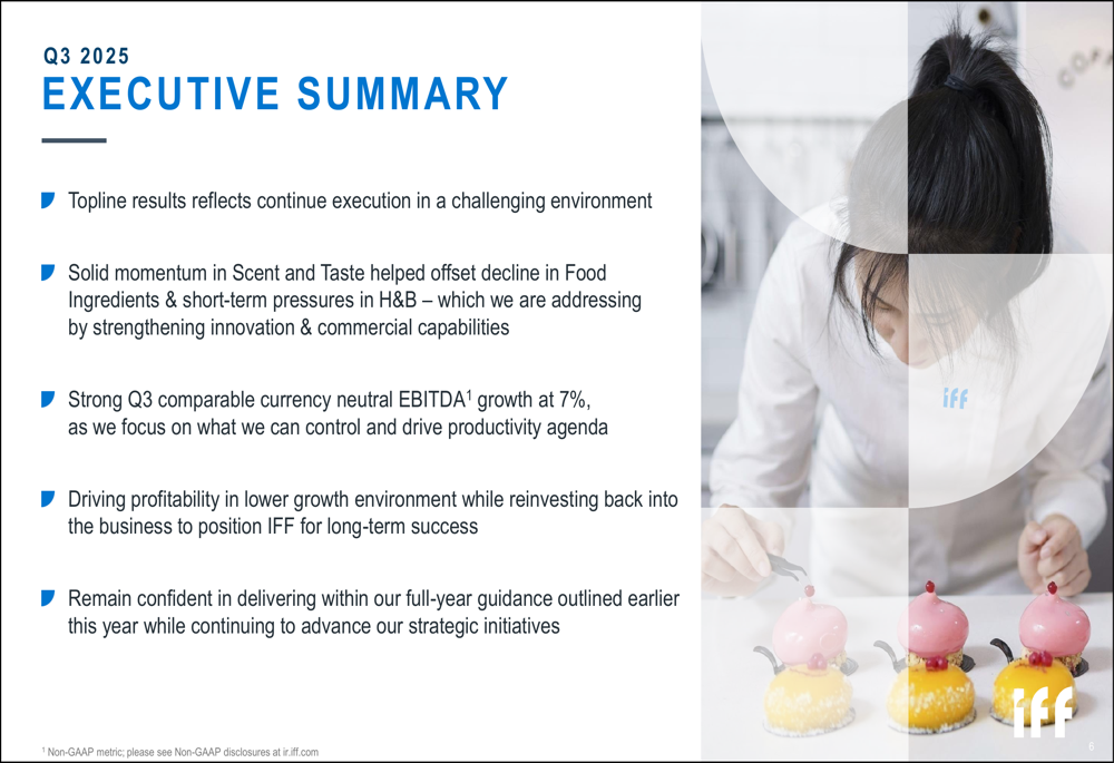 A International Flavors & Fragrances Inc (Nova York:IFF) apresentou seus resultados do terceiro trimestre de 2025 em 5 de novembro, mostrando resiliência em um ambiente operacional desafiador. A empresa reportou vendas comparáveis em moeda constante estáveis, mas alcançou um crescimento de 7% no EBITDA operacional ajustado em base comparável de moeda constante, demonstrando gestão eficaz de custos e iniciativas de produtividade.