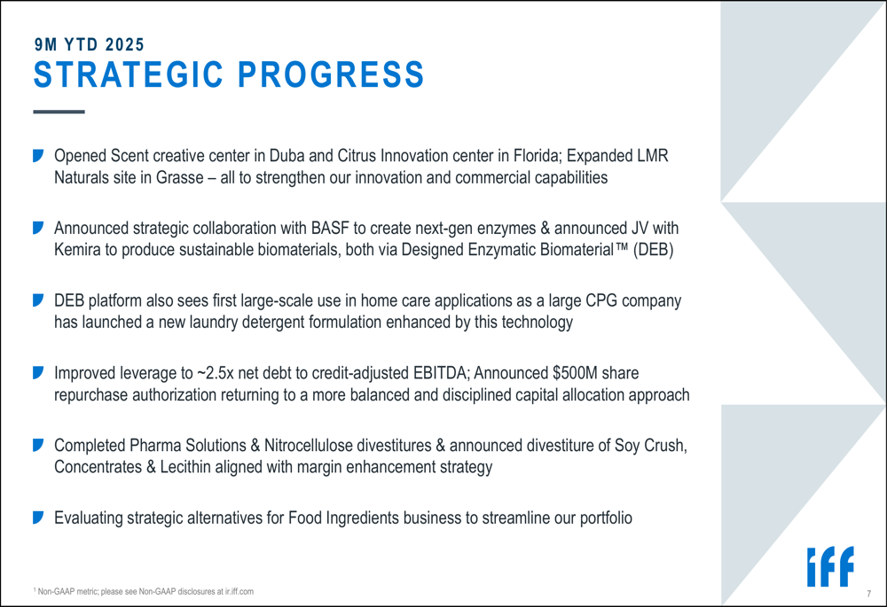 Durante os primeiros nove meses de 2025, a IFF fez progressos significativos em iniciativas estratégicas destinadas a fortalecer sua posição competitiva e aumentar a criação de valor a longo prazo. A empresa expandiu suas capacidades de inovação ao abrir um centro criativo de Fragrâncias em Dubai e um centro de Inovação de Cítricos na Flórida, além de expandir seu site LMR Naturals em Grasse, França.