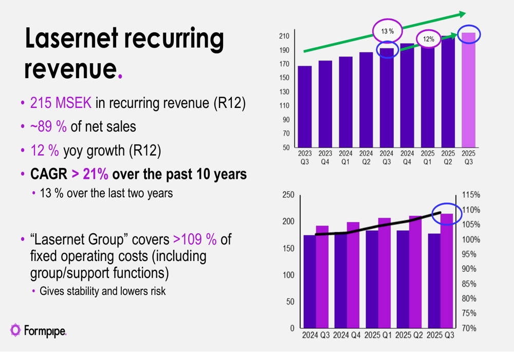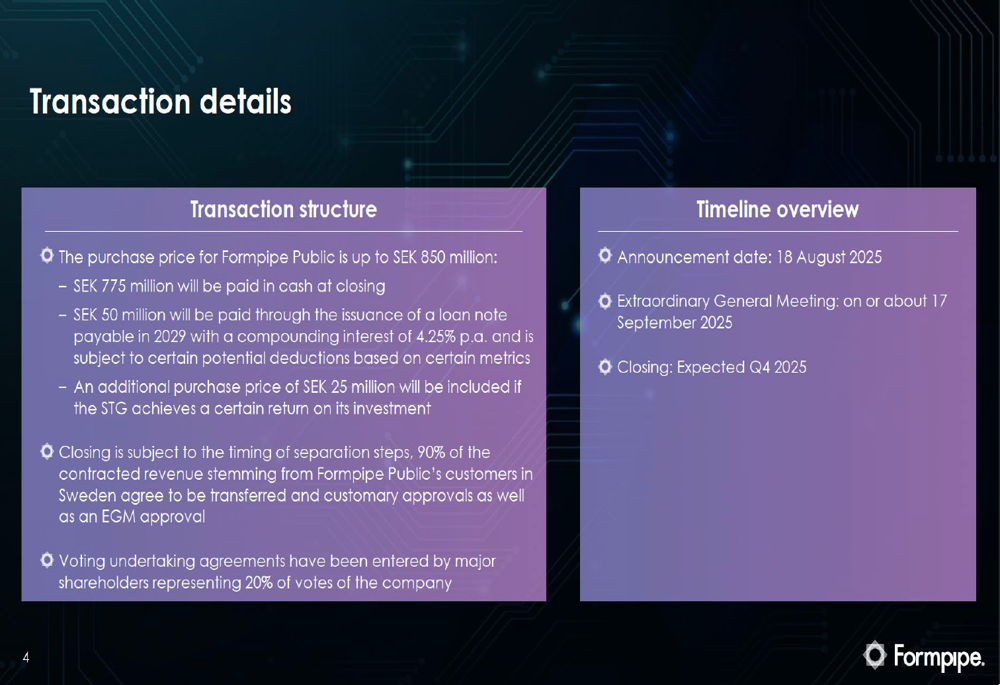 A apresentação destacou a contínua melhoria das margens da FormPipe e o processo de alienação em andamento de seu negócio de setor público, com uma transação avaliada em até SEK 850 milhões com previsão de conclusão em 1º de dezembro de 2025.