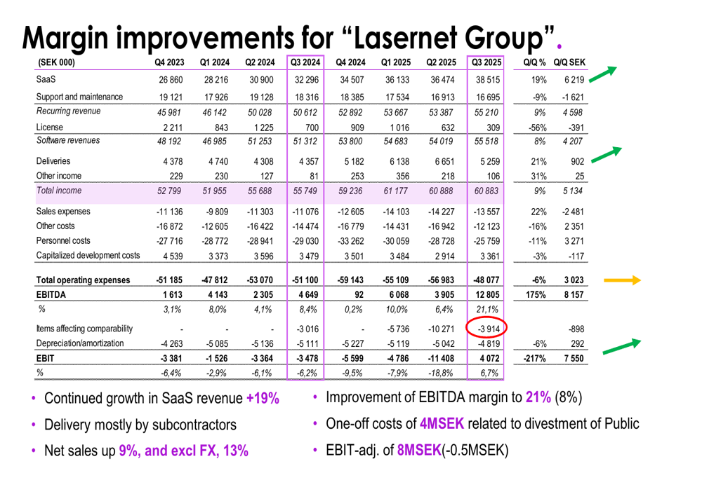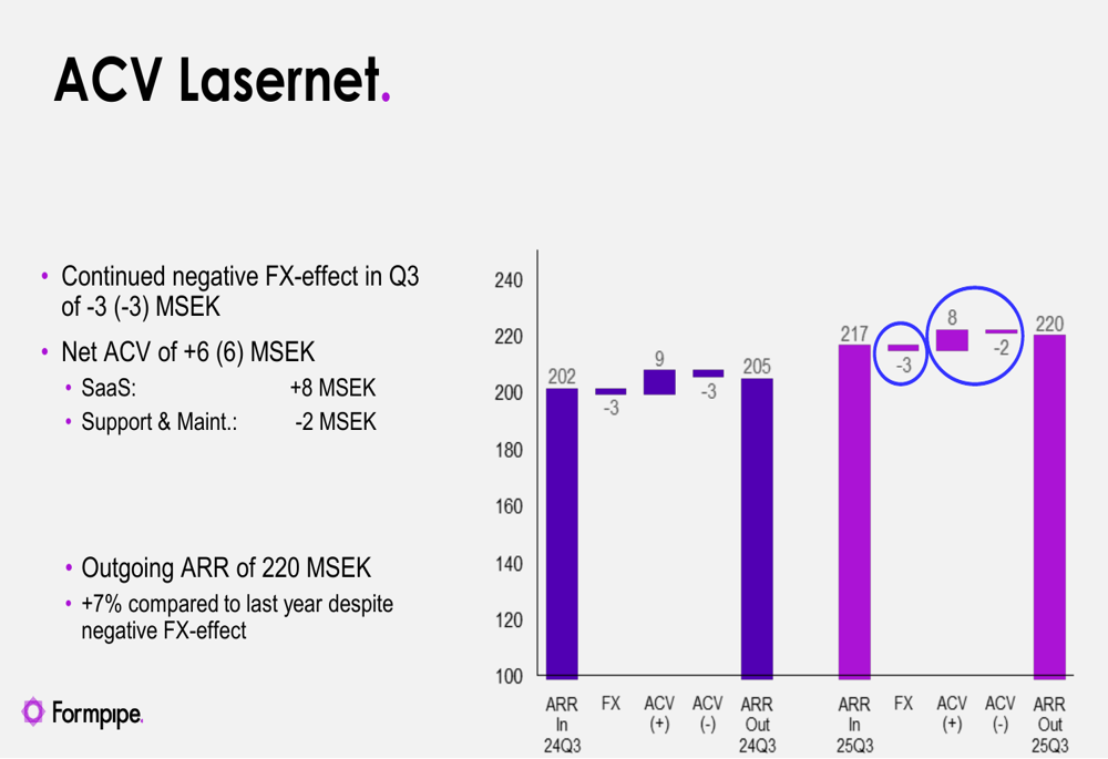 Apesar dos efeitos cambiais negativos de -3 MSEK no 3º tri, a empresa alcançou um ACV líquido de +6 MSEK, com SaaS contribuindo com +8 MSEK enquanto Suporte & Manutenção diminuiu em 2 MSEK. A Receita Recorrente Anual (ARR) final é de 220 MSEK, representando um crescimento de 7% em comparação ao ano anterior, apesar do impacto cambial adverso.