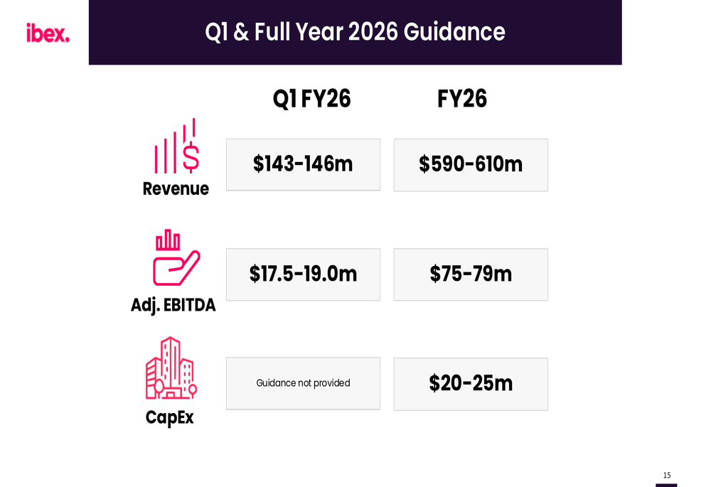 Olhando para o ano fiscal de 2026, a IBEX forneceu orientação para receita entre US$ 590-610 milhões, representando aproximadamente 5,7-9,3% de crescimento em relação ao ano fiscal de 2025. O EBITDA ajustado deve ficar na faixa de US$ 75-79 milhões, sugerindo contínua expansão de margem.