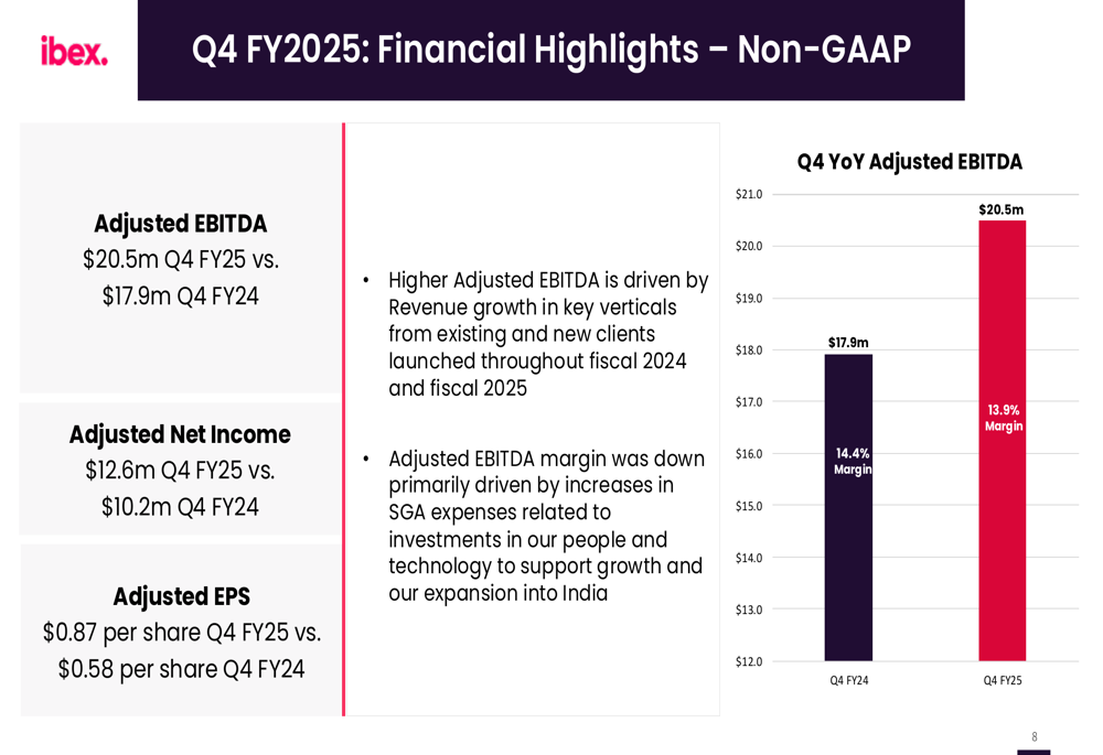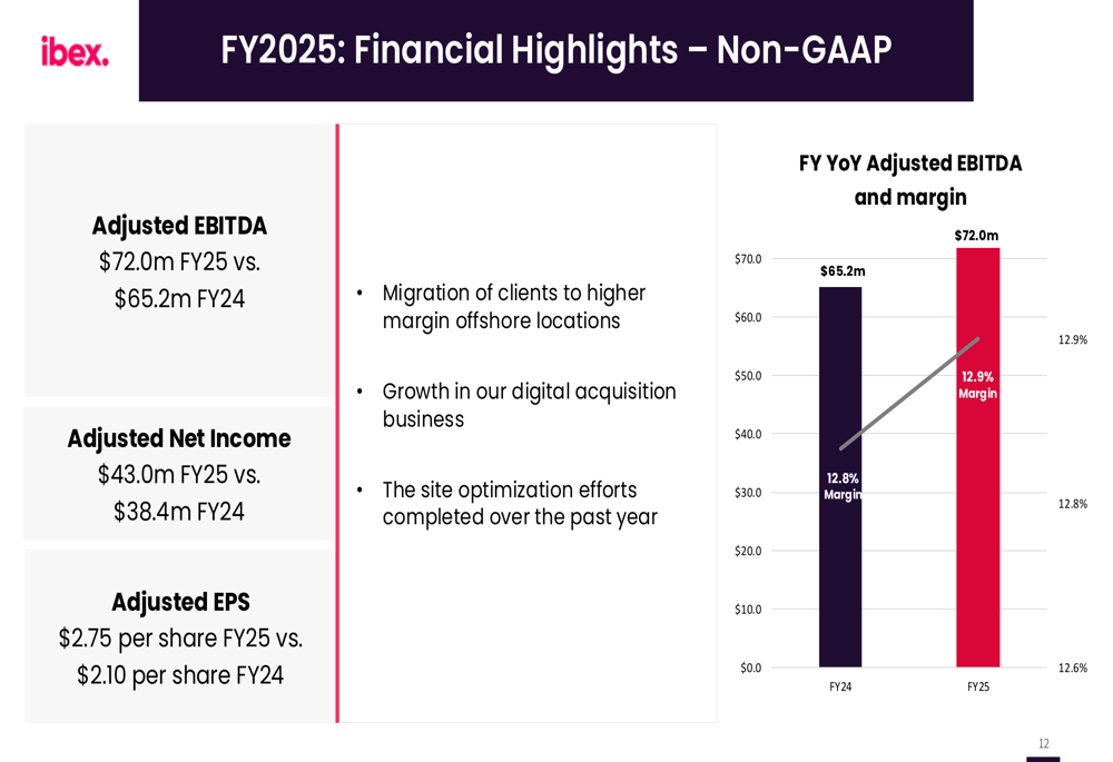 Para o ano fiscal completo de 2025, a IBEX reportou receita de US$ 558,3 milhões, um aumento de 9,8% em relação ao ano anterior. O EBITDA ajustado alcançou US$ 72,0 milhões com margem de 12,9%, um aumento de 10,4% em relação ao ano anterior. A empresa atingiu lucro líquido ajustado recorde de US$ 43,0 milhões, um aumento de 12,1%, e LPA ajustado recorde de US$ 2,75, um aumento de 30,7% em relação ao ano anterior.