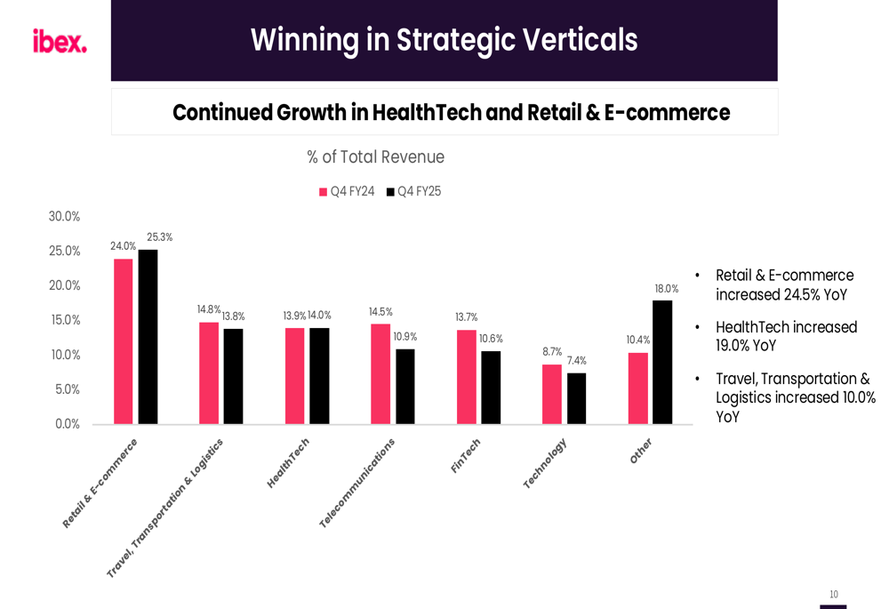 A IBEX continuou a diversificar sua base de clientes, com os cinco principais clientes agora representando 35,5% da receita, enquanto o maior cliente representa 9,6%. A empresa agora atende 62 clientes com receita anual superior a US$ 1 milhão, quase o dobro dos 32 clientes na época de seu IPO. Da mesma forma, clientes gerando mais de US$ 5 milhões em receita aumentaram para 27, de 13 no IPO.